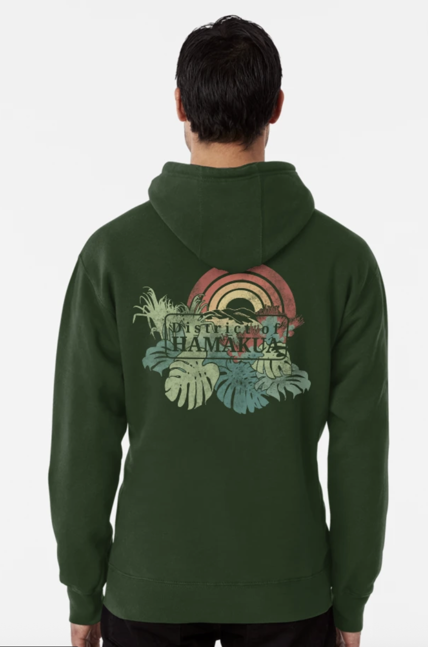 Tropical, vintage illustration of monstera leaves, sugar cane, ohia lehua flowers, Mauna Kea, and a rainbow on a forest green sweatshirt.