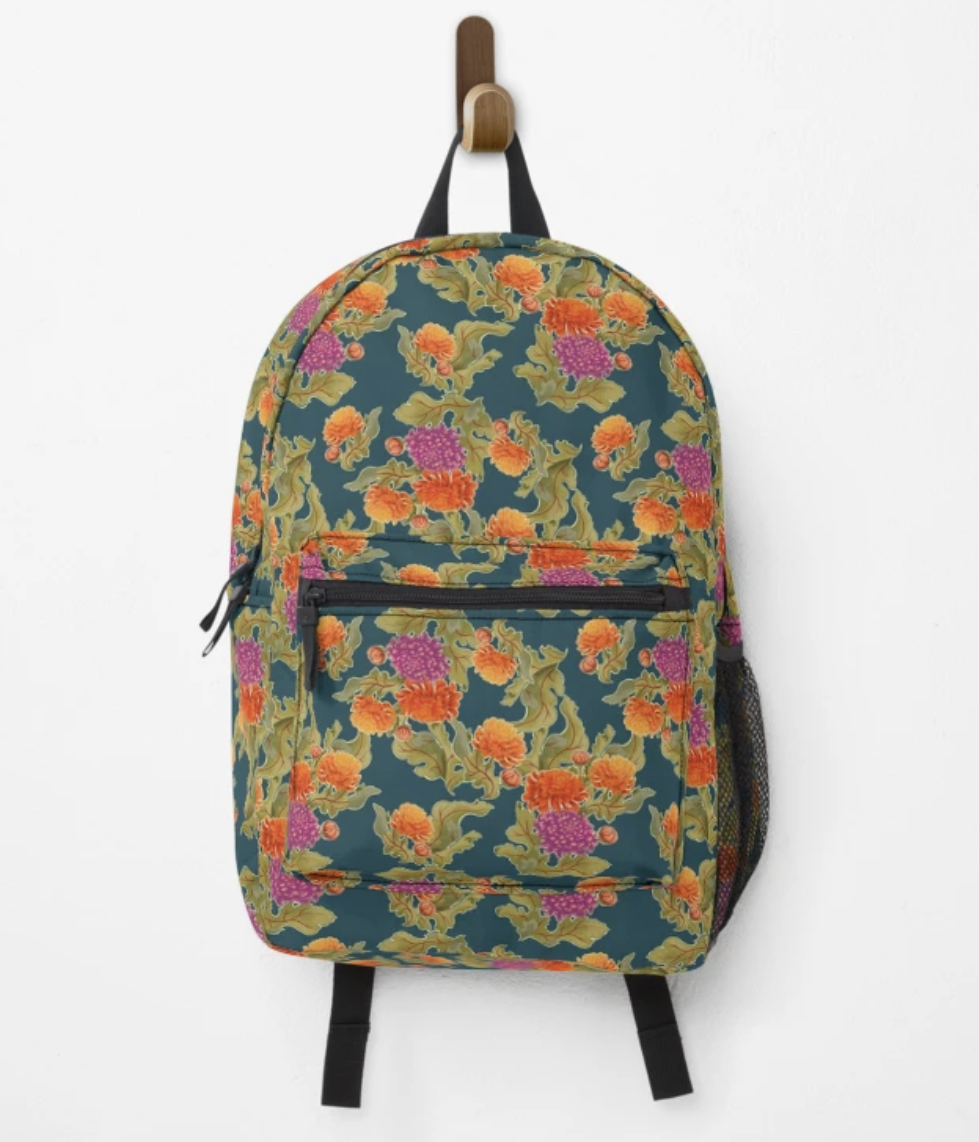 A watercolor painting of a red flowering Ohia tree with green leaves and small red buds against a soft blue and green background.